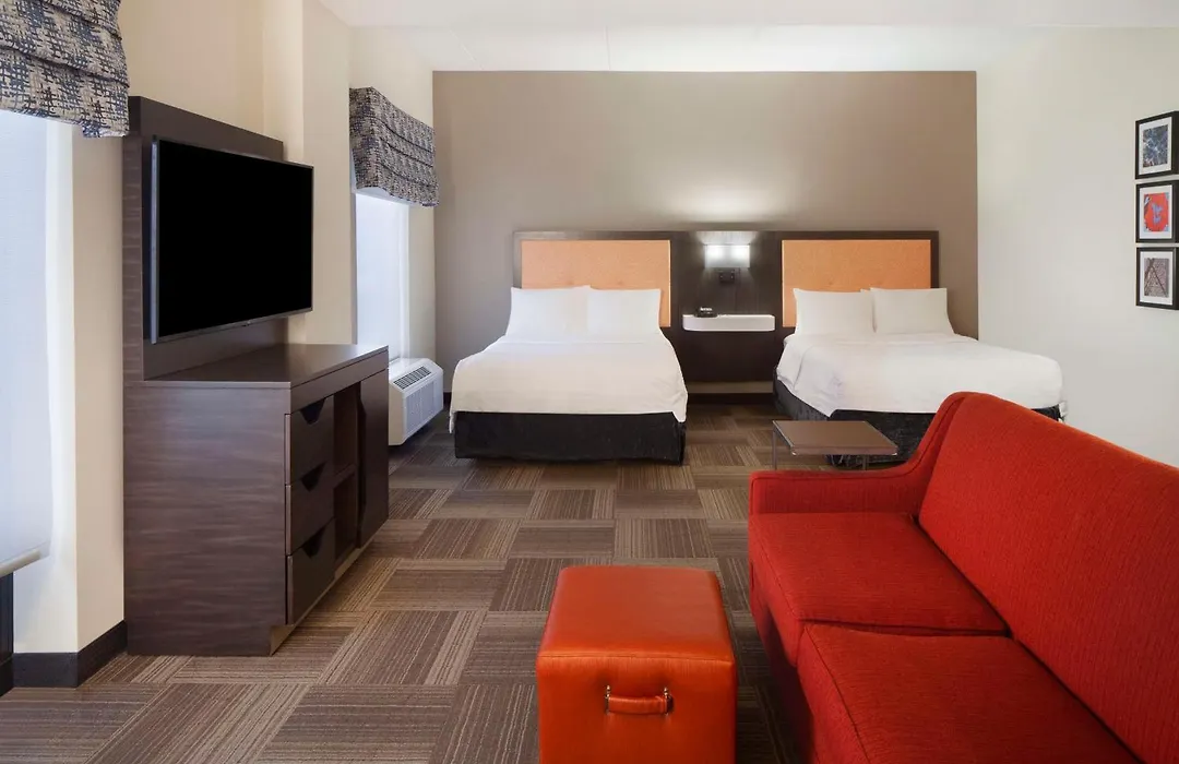A lowered sink and a raised toilet along with a microwave oven, a coffee maker, and a fridge are standard in the rooms.